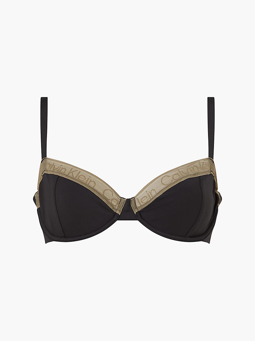 Dámská plavková podprsenka má nevyztužené košíčky s kosticí v černé barvě, které jsou kolem výstřihu lemovány efektní krajkou s nápisy značky Calvin Klein.
