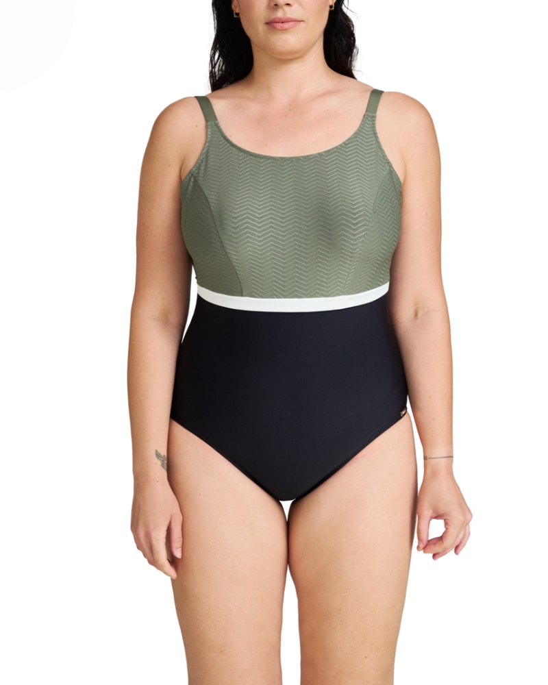 Plavky v efektním barevném provedení khaki-černé barvy mají podprsenkovou část tvarovanou.