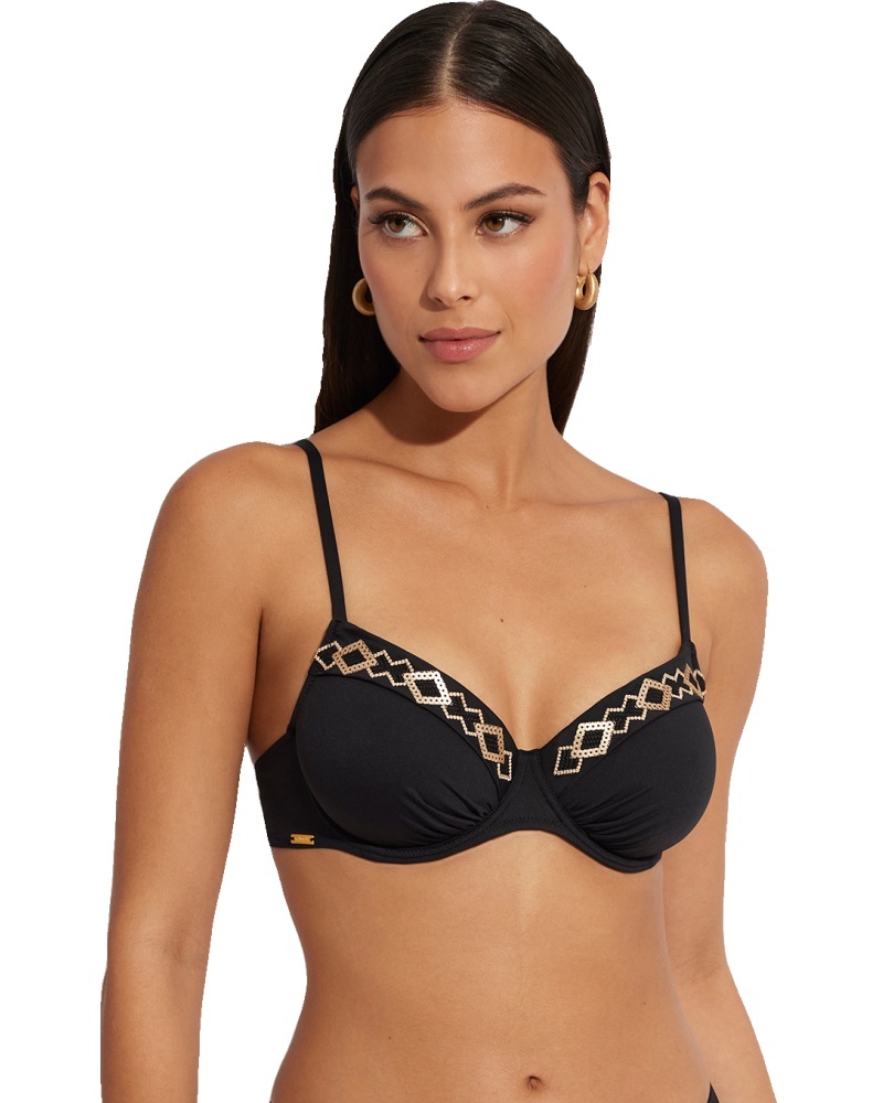 Plavková podprsenka má nevyztužené košíčky s kosticemi, horní část košíčků je zdobena elegantním zlato-černým prošitím s flitrami.