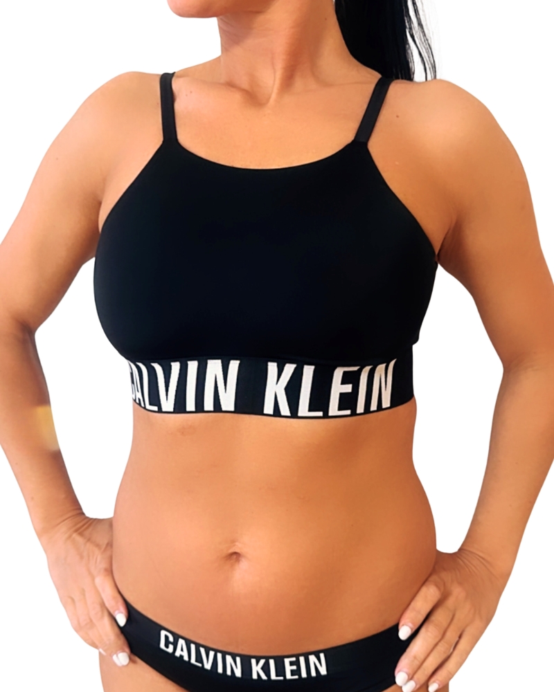 Dámská plavková podprsenka má obvod tvořen širší gumou s nápisem značky Calvin Klein a vzadu je na zapínání širší sponou.