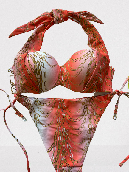 Podprsenka má širší látková ramínka, která se dají zavazovat za krkem nebo zavázat na zádech a opálit si tak krásně celý dekolt. Vzadu má podprsenka zapínání na háček.