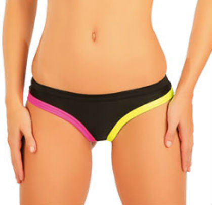 Plavkové kalhotky bokové. Kontrastní lemování. 3D logo. Chloruodolný materiál. 80% Polyamid + 20% Elastan/ Lycra Xtra Life Černá + reflexní žlutá + reflexní růžová. 36, 38, 40, 42
