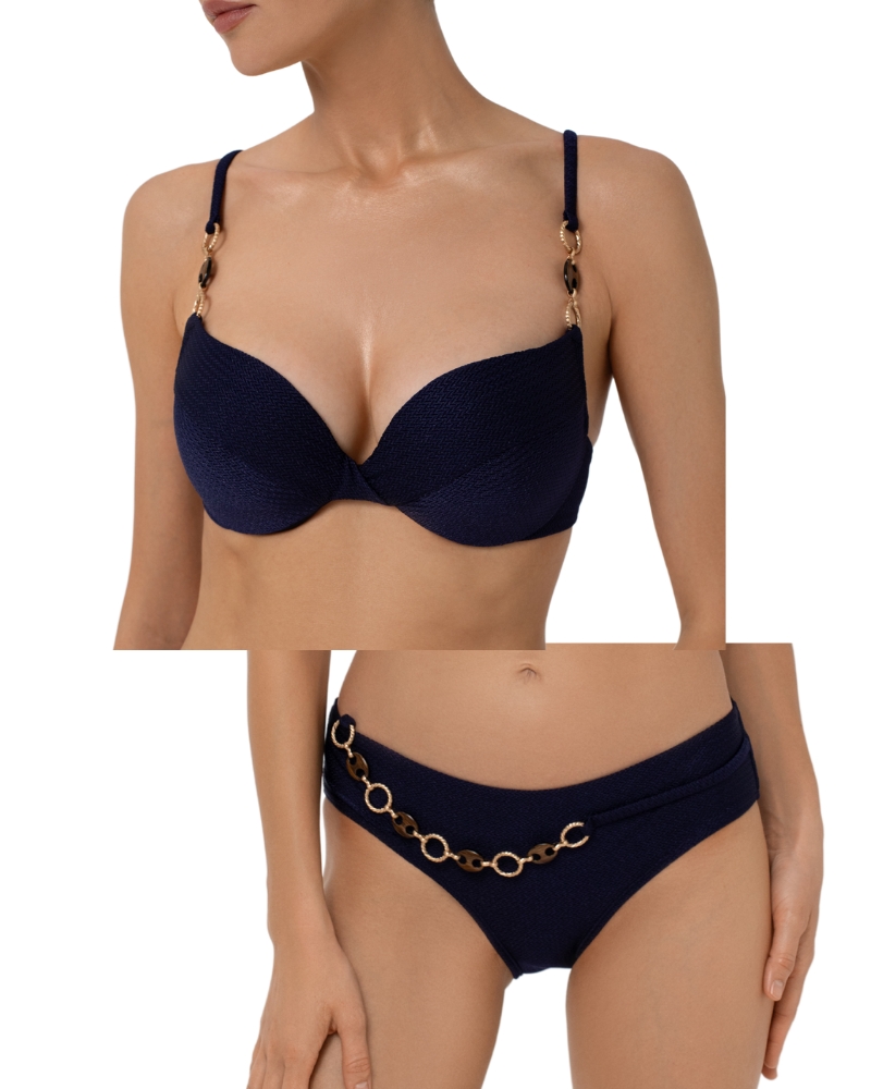 Kolekce Stella di Mare je z nádherné tmavě modré vysoce kvalitní plavkové látky s jemným vzorem a doplňky.