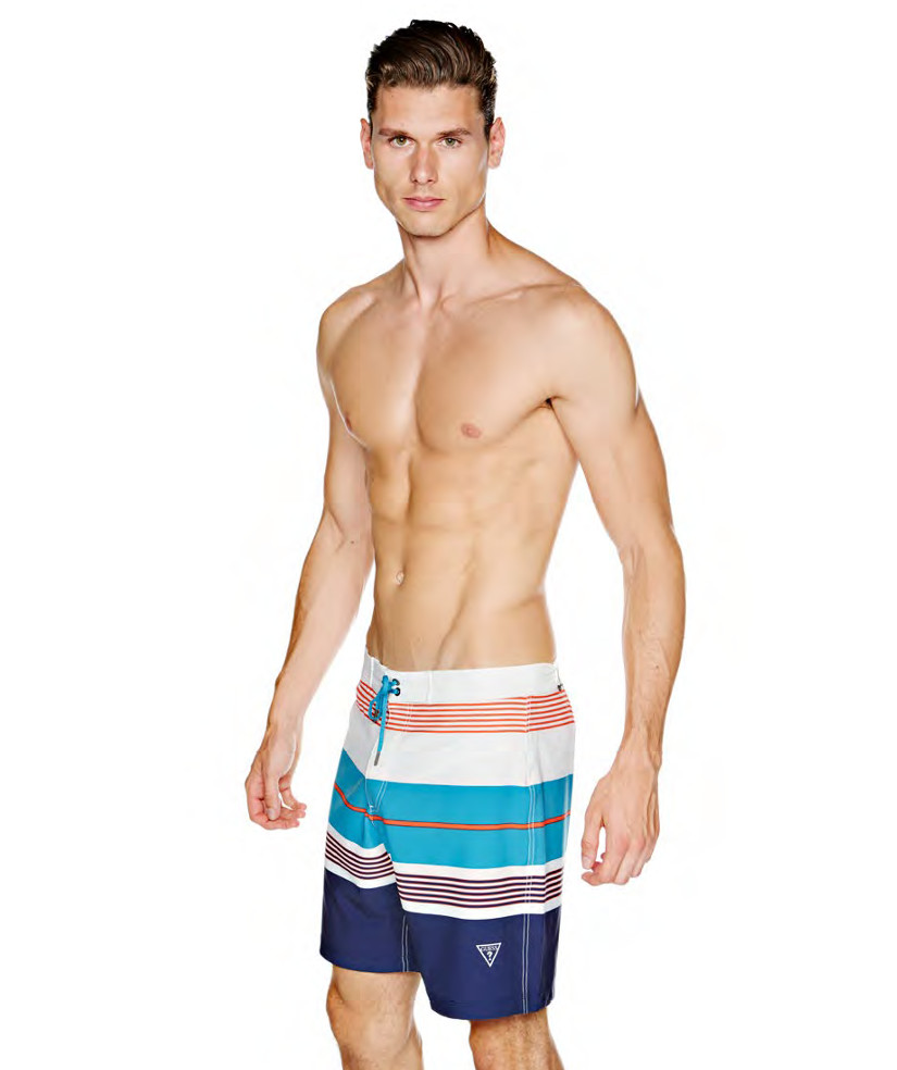 Pánské plavky nemají v pase gumu ale mají šňůrku na zavazování. Plavky jsou v barevném pruhovaném vzoru s malým logem Guess.