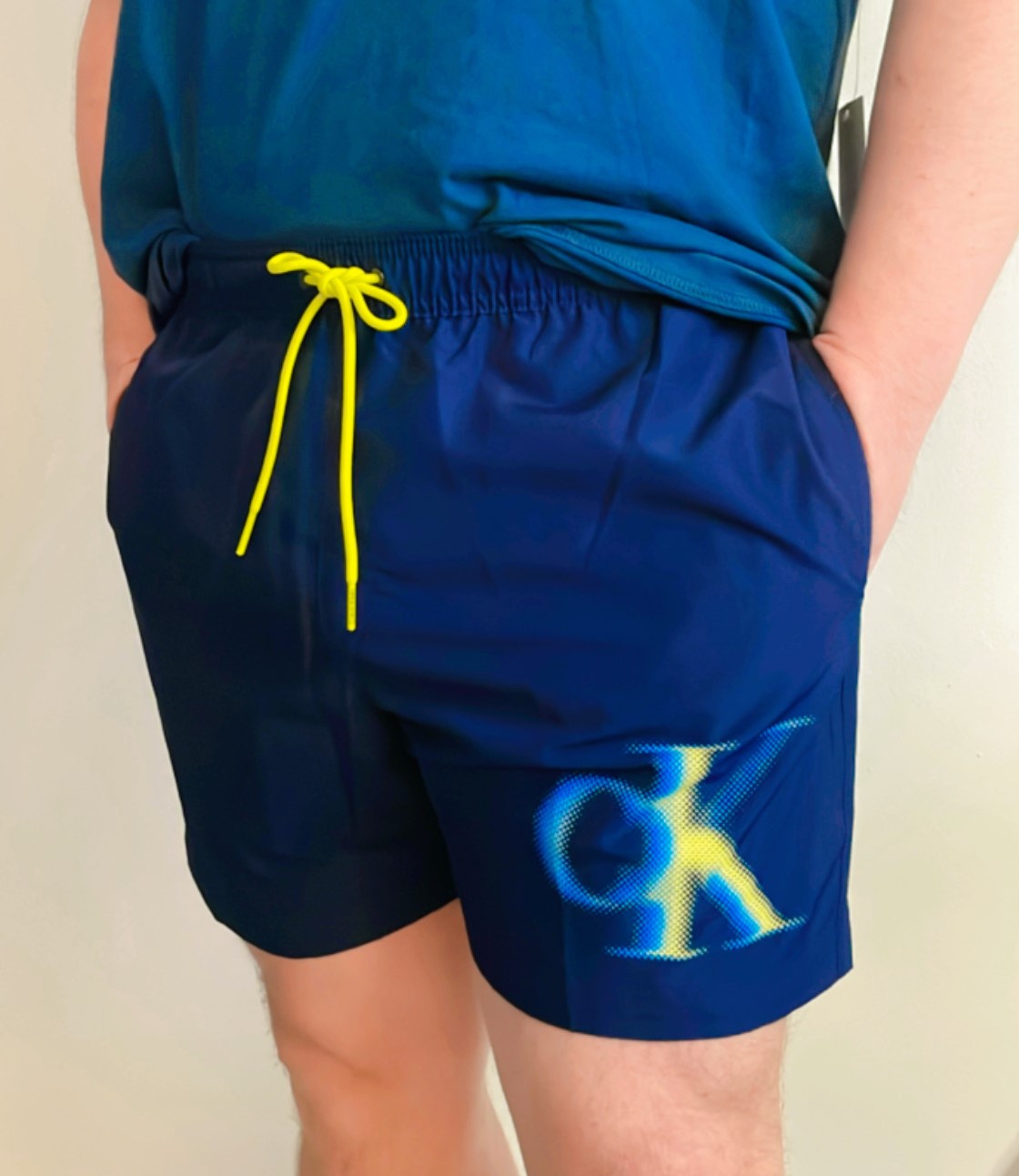 Pánské šortky mají v pase skrytou gumu a stahovací žlutou šňůrku. Na levé nohavici je stylový duhový nápis CK.